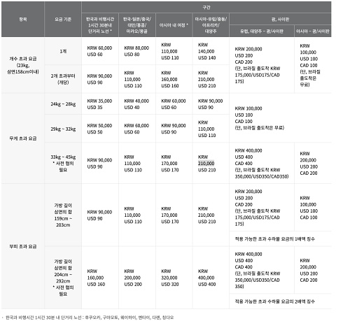미주와 마찬가지로 무게와 규격 초과 시 각각 초과 수화물 요금이 합산되어 부과됩니다.